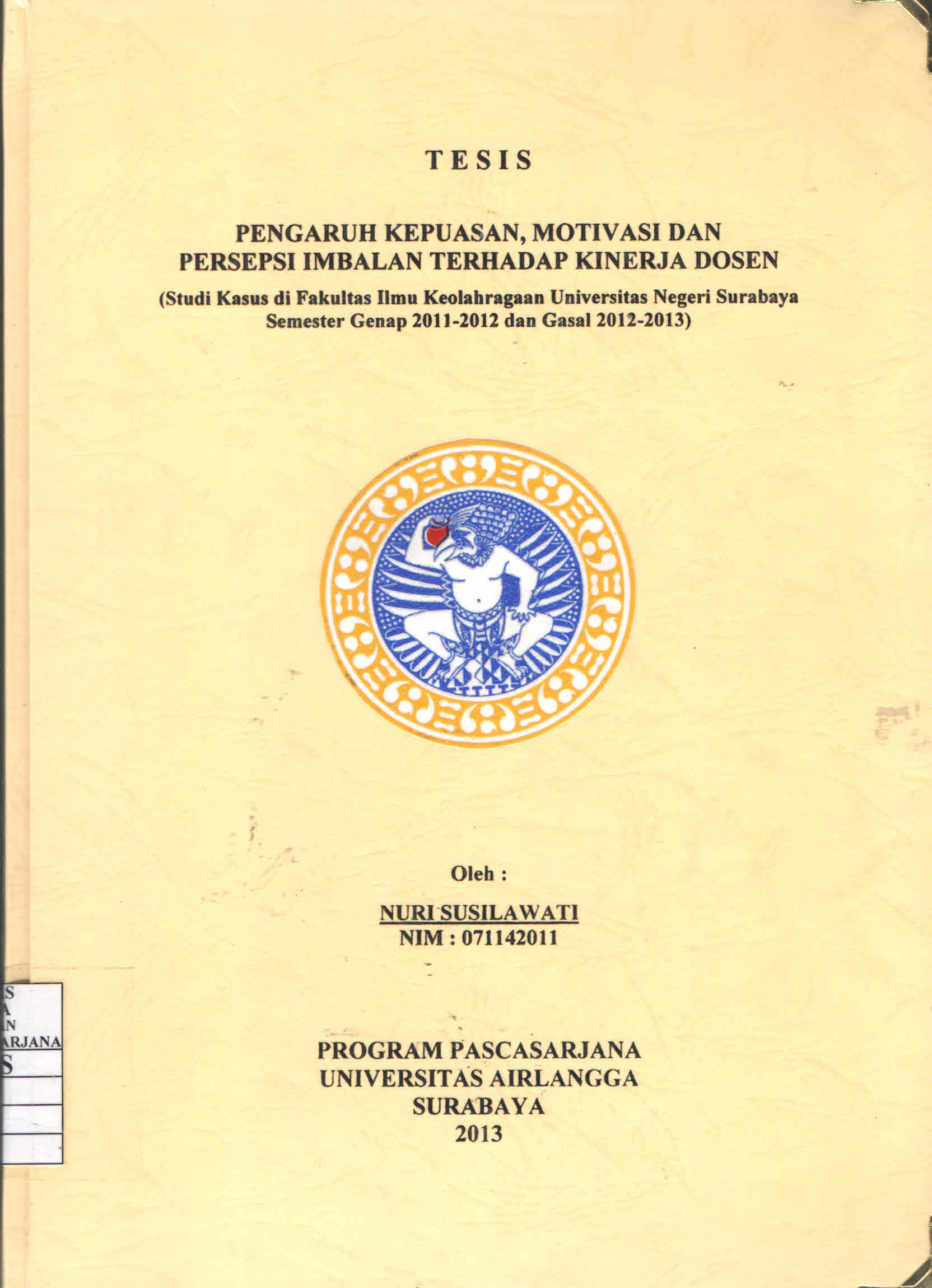 | Judul | Pengaruh Kepuasan, Motivasi dan Persepsi Imbalan Terhadap Kinerja Dosen : Studi Kasus di Fakultas Ilmu Keolahragaan Universitas Negeri Surabaya Semester Genap 2011-2012 dan Gasal 2012-2013 / Nuri Susilawati |
