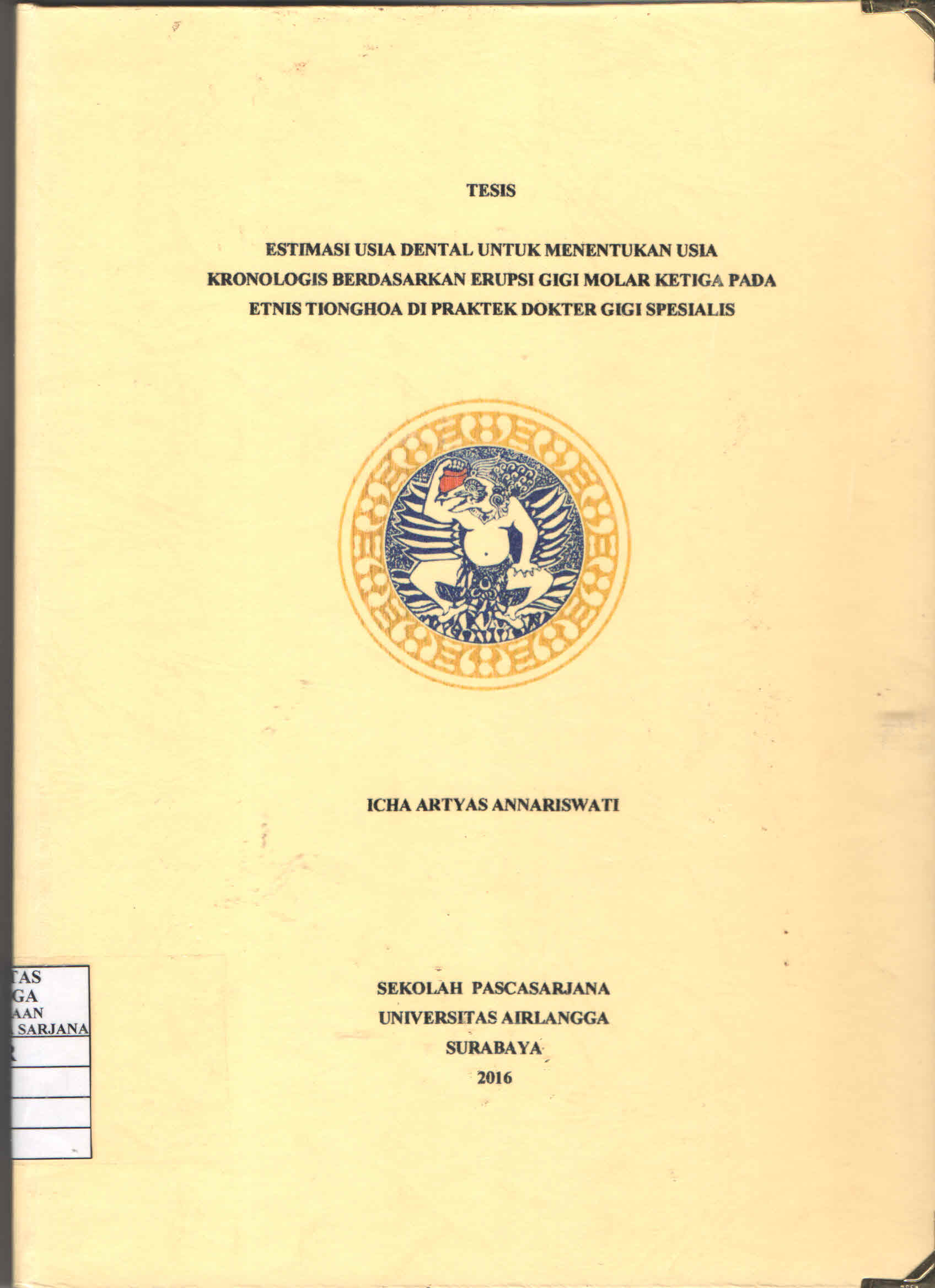 | Judul | Estimasi Usia Dental untuk Menentukan Usia Kronologis Berdasarkan Erupsi Gigi Molar Ketiga Pada Etnis Tionghoa di Praktek Dokter Gigi Spesialis / Icha Artyas Annariswati |