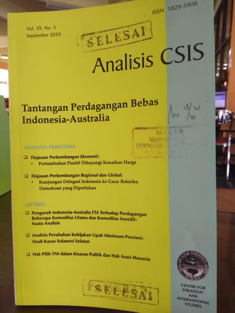 | Judul | Analisis CSIS : Tantangan Perdagangan Bebas Indonesia-Australia Vol. 39 No. 3 / Vidhyandika D. Perkasa |