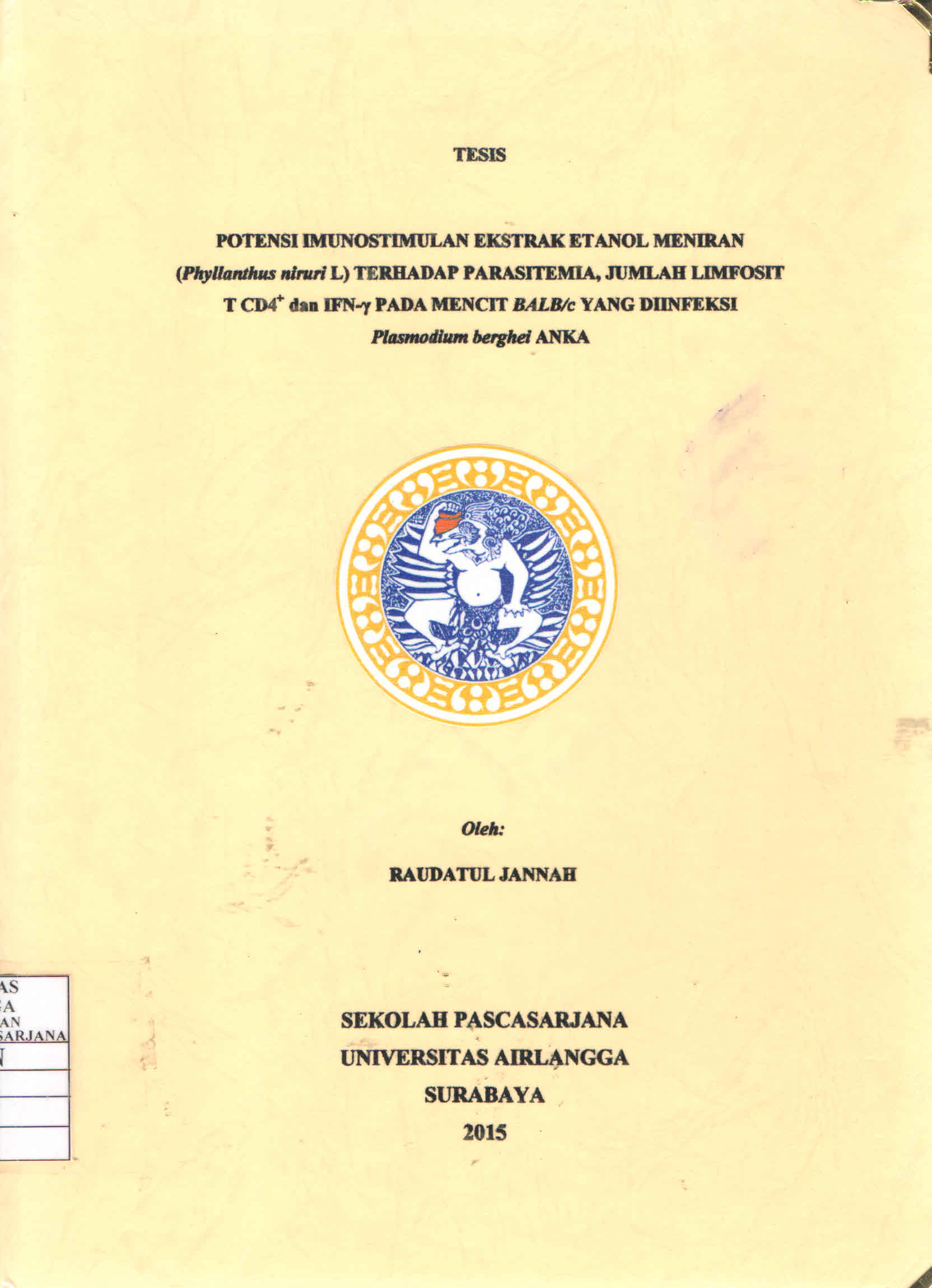 | Judul | Potensi Imunostimulan Ekstrak Etanol Meniran (Phyllanthus ninuri L) Terhadap Parasitemia, Jumlah Limfosit T CD4? dan IFN-? pada Mencit BALB/C yang Diinfeksi Plasmodium berghei ANKA / Raudatul Jannah |