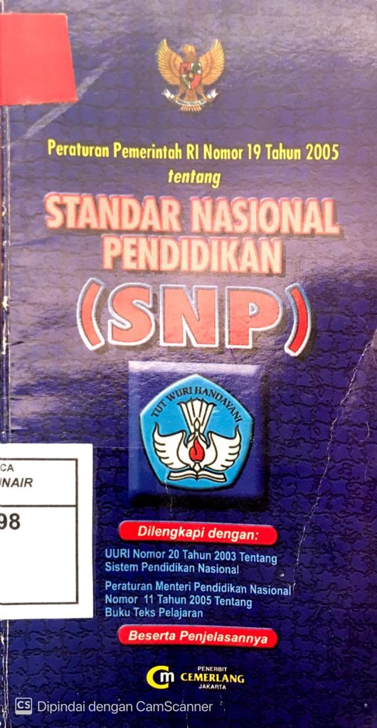 | Judul | Peraturan Pemerintah RI Nomor 19 Tahun 2005 Tentang : Standar Nasional Pendidikan (SNP) / Indonesia. Undang-Undang. Peraturan, dsb. |