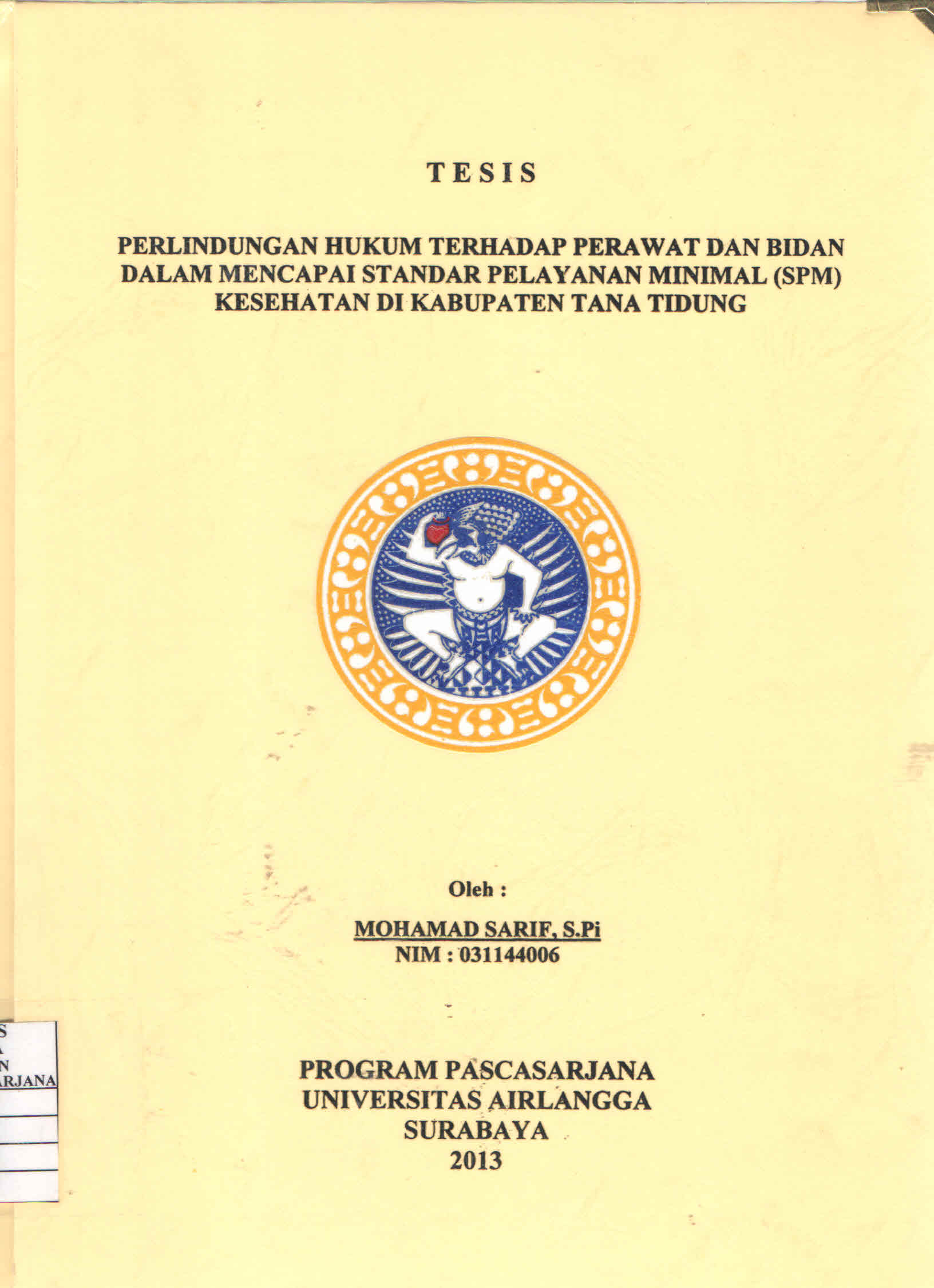 | Judul | Perlindungan Hukum Terhadap Perawat dan Bidan dalam Mencapai Standar Pelayanan Minimal (SPM) Kesehatan di Kabupaten Tana Tidung / Mohamad Sarif |